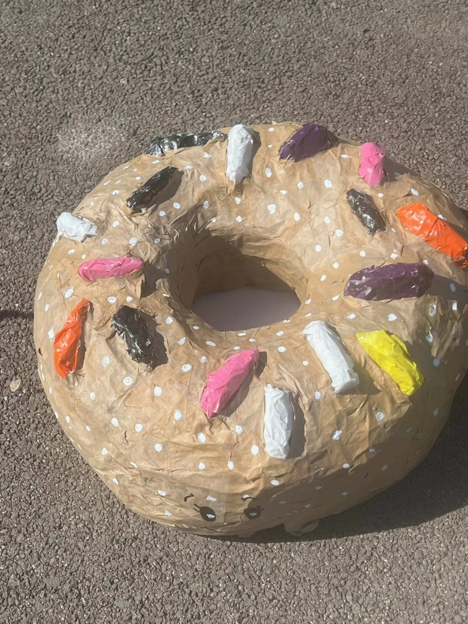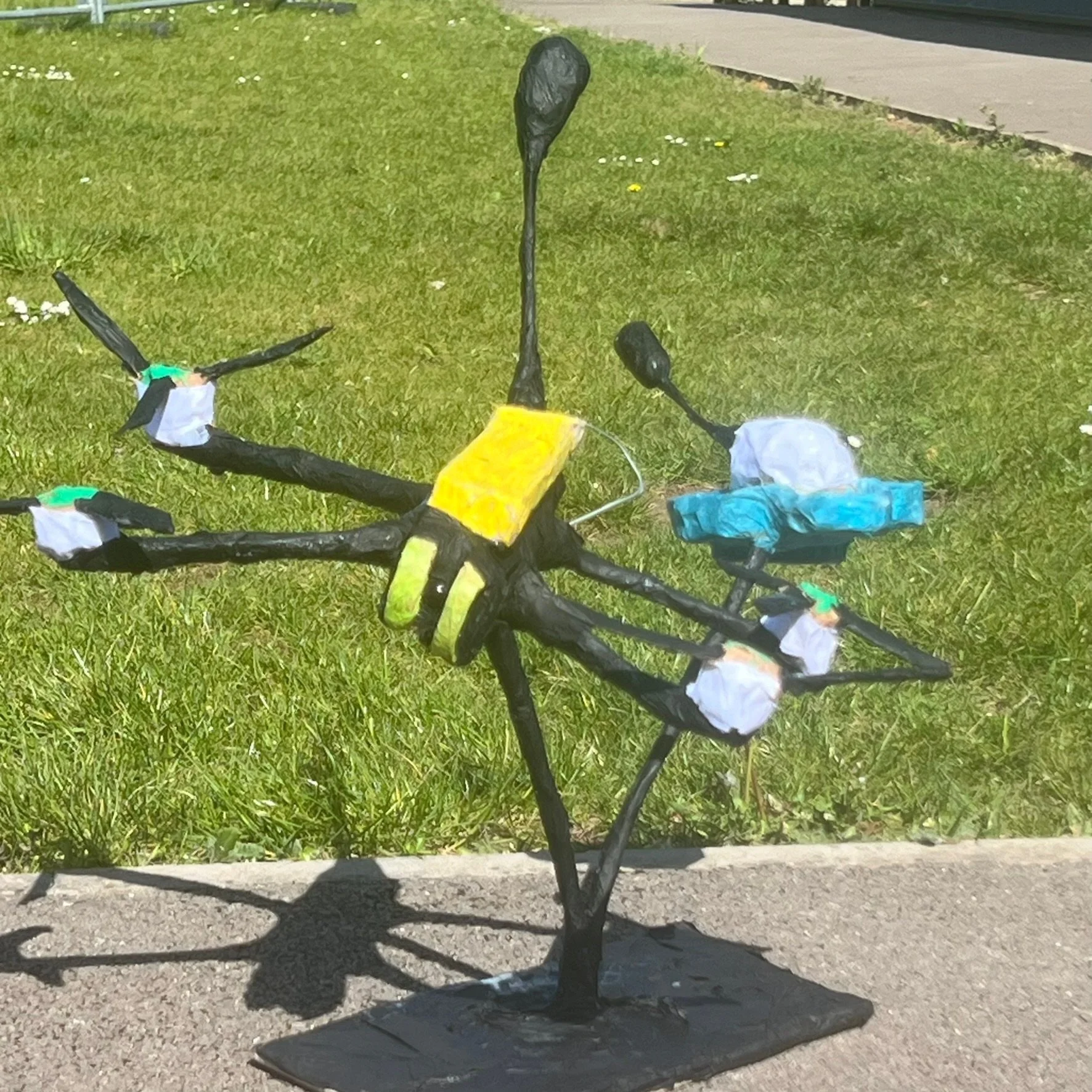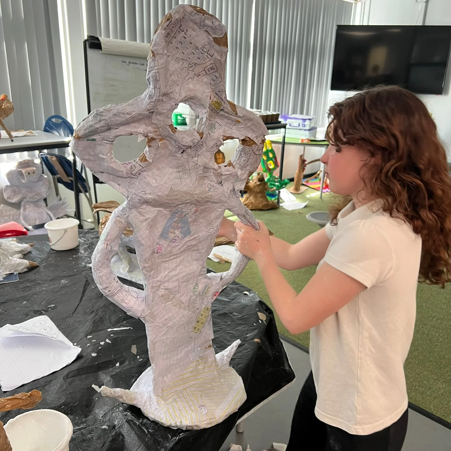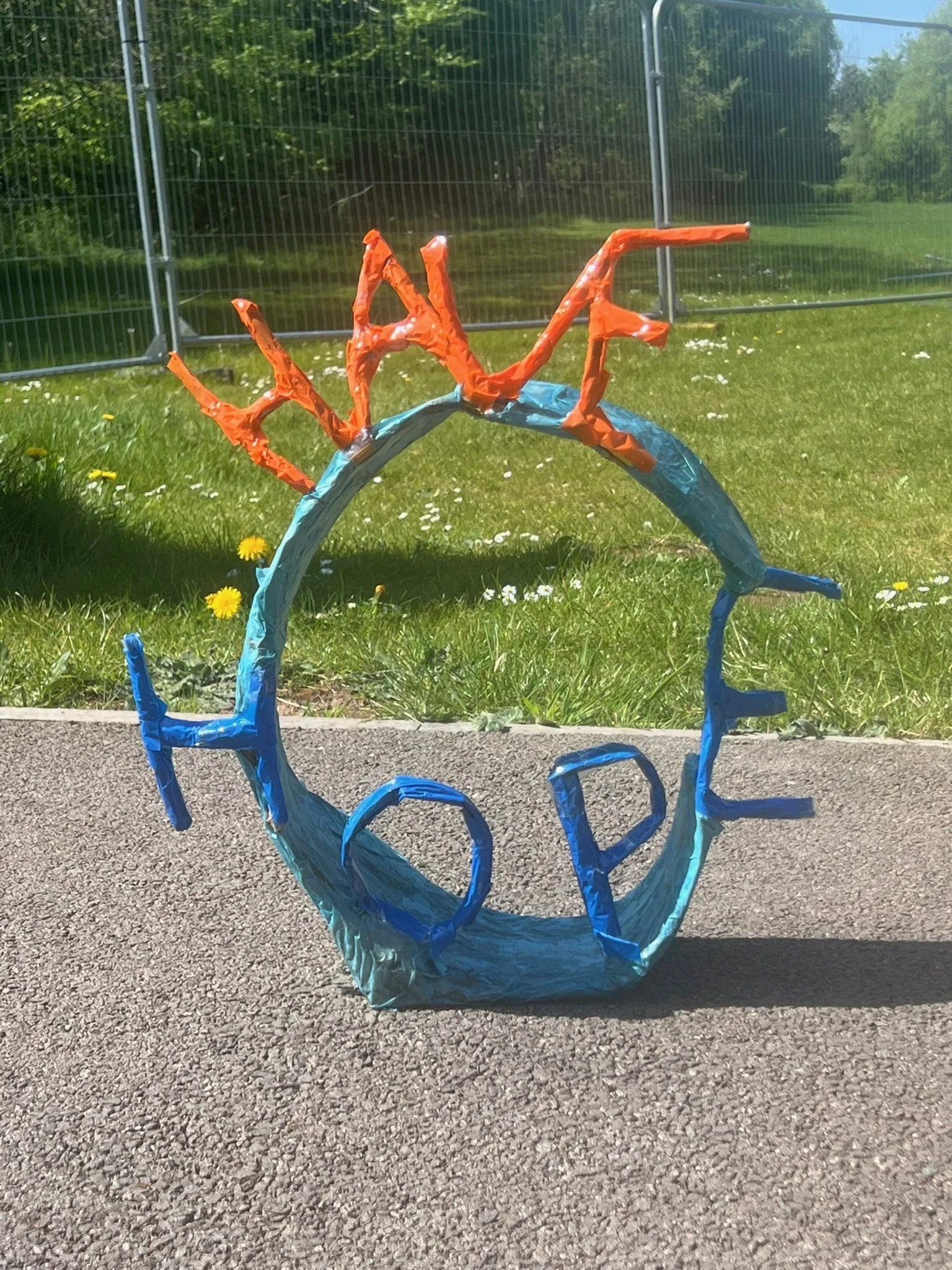‘My Space’ was the theme I gave the older group of children (ranging from Year 7 - Year 10). I briefed them to base their individual sculptures on anything that they related to in their life. Maybe an element of what they like doing in their free time or their interests, ambitions or dreams. Some of the children used words, phrases or a name to construct their 3D framework on, then layers of paper mache to add details.