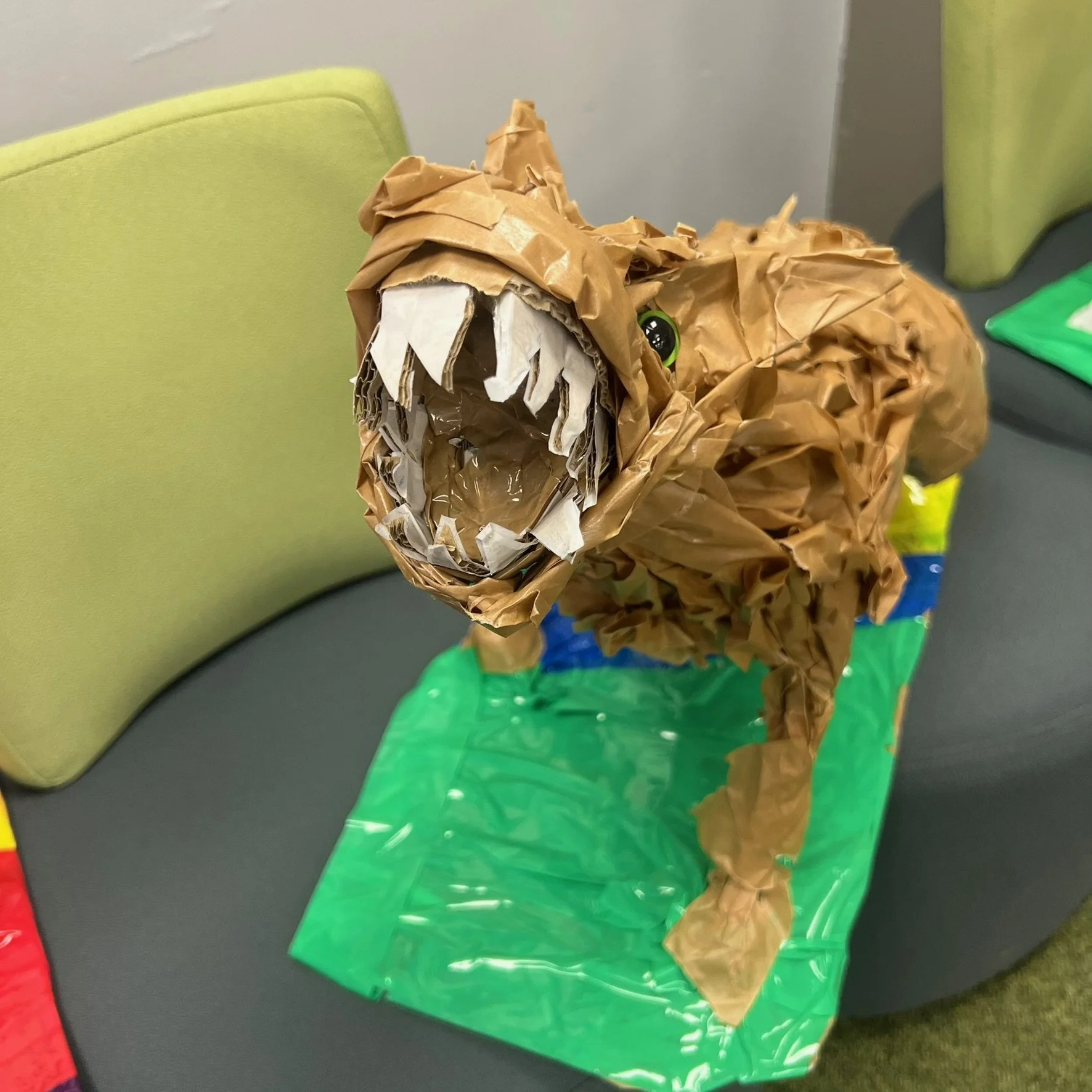 Each child (ranging from Year 2 - Year 6) was supported to create their own individual sculpture using newspaper, wire and sticky tape, with waste colour and printed papers for the decoration and details. They also did a drawing to visualise their ideas and work out how to construct them in 3D. Love their imaginative response to the theme of my monster!